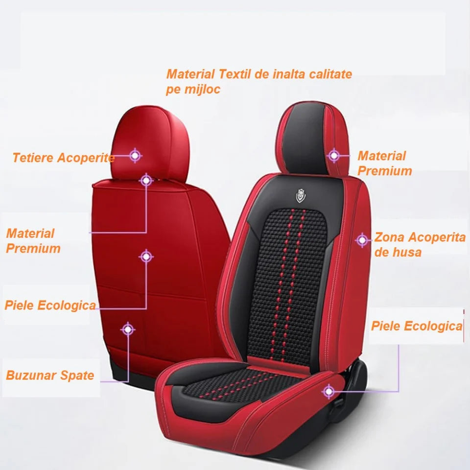Este un produs de o calitate Premium, cu un design deosebit, care va va proteja materialul scaunelor, sporind simultan confortul interior al autovehiculului. Material : Piele Ecologica de cea mai buna calitate , calitatea 1 (material special pentru tapiterii auto) + Textil Setul contine : 2 huse scaune fata,Tetiere scaune fata , 2 huse bancheta, 3 huse tetiere spate; Husa bancheta spatar este fractionata Cotiera spate ramane complet functionala (in cazul in care masina este prevazuta cu cotiera spate) Scaunele fata sunt acoperite in totalitate : Fata,Spate,Laterale scaun cu zona dedicata airbagului din scaun Pe spatele scaunelor fata husa este prevazuta si cu buzunar pentru depozitare Cele 4 pernute din fotografii NU SUNT INCLUSE