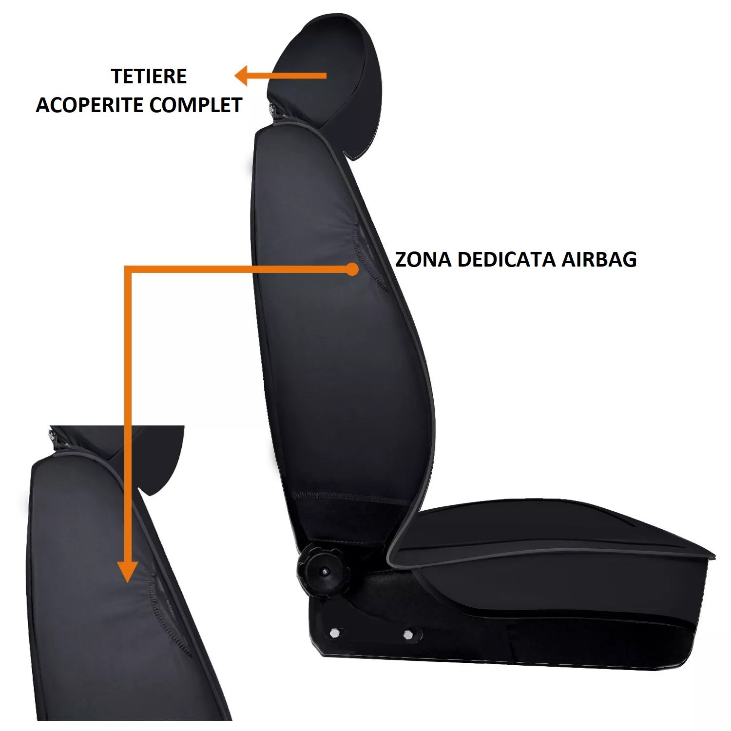 Este un produs de o calitate Premium, cu un design deosebit, care va va proteja materialul scaunelor, sporind simultan confortul interior al autovehiculului. Material : Piele Ecologica de cea mai buna calitate , calitatea 1 (material special pentru tapiterii auto) Setul contine : 2 huse scaune fata,Tetiere scaune fata , 2 huse bancheta, 3 huse tetiere spate; Husa bancheta spatar este fractionata Cotiera spate ramane complet functionala (in cazul in care masina este prevazuta cu cotiera spate) Scaunele fata sunt acoperite in totalitate : Fata,Spate,Laterale scaun cu zona dedicata airbagului din scaun Pe spatele scaunelor fata husa este prevazuta si cu buzunar pentru depozitare Cele 4 pernute din fotografii NU SUNT INCLUSE